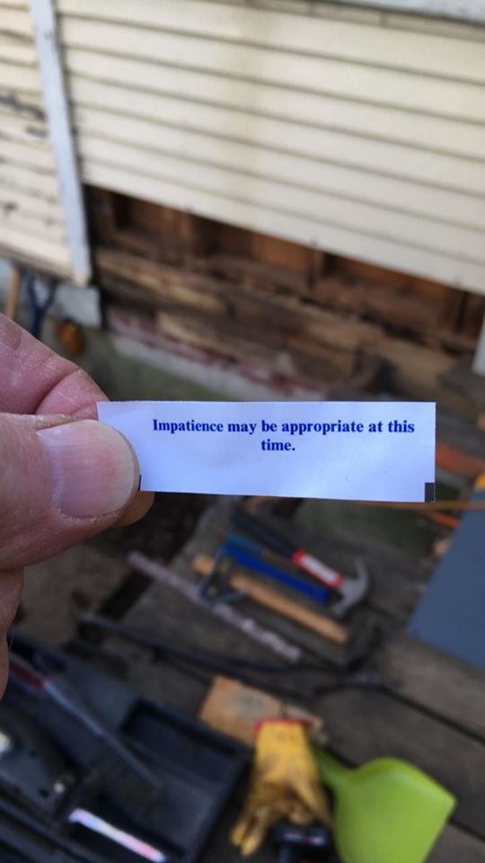 This was in the fortune cookie I got with my Singapore Mei-fun at China Wok today. I may put it in the wall now for the next owners! Rebuilding half the deck which has started rotting away with water damage....