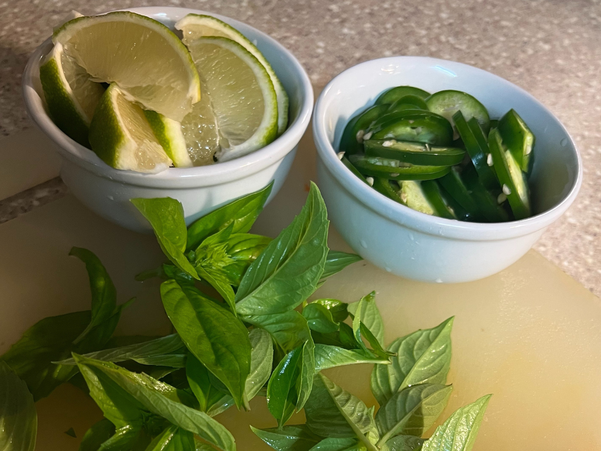 - Wash/dry several fresh sweet basil leaves to add a leaf onto a bite in your bowl
