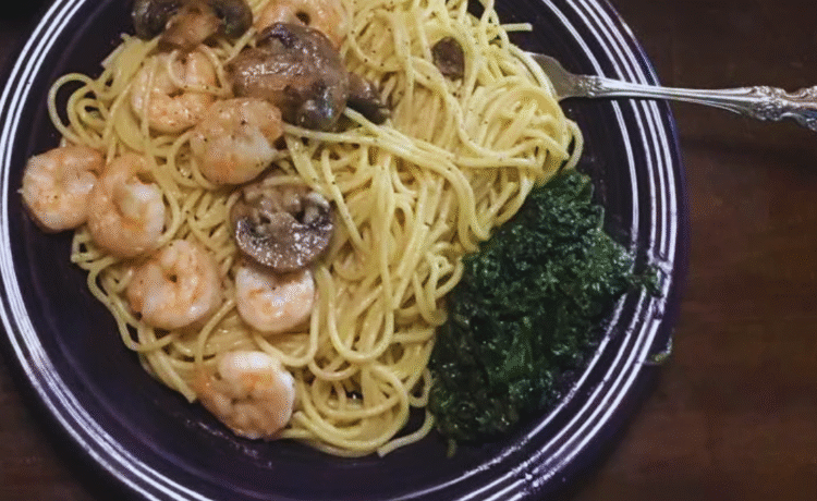 - Cook 4 ounces thin spaghetti in rapidly boiling salted water for 10 minutes. (“Use long fork to stir spaghetti so it won’t wed,” were the chef’s romantic directions!) Drain, rinse with cold water and set aside.