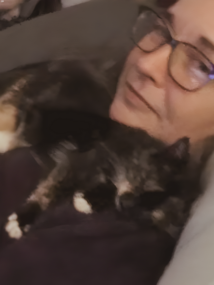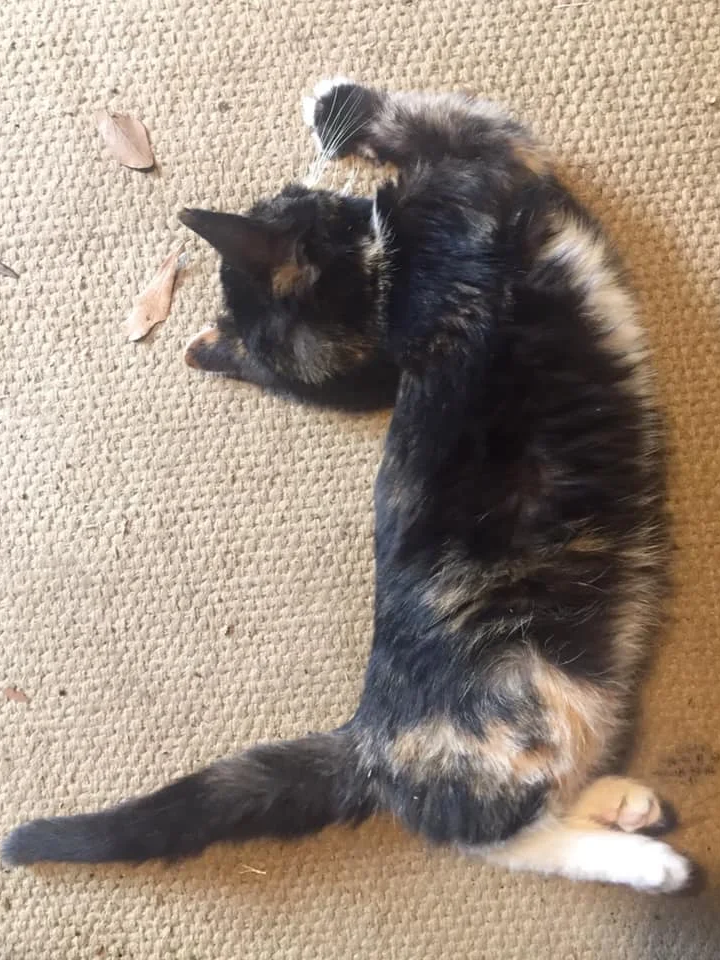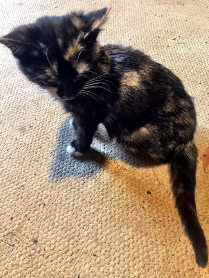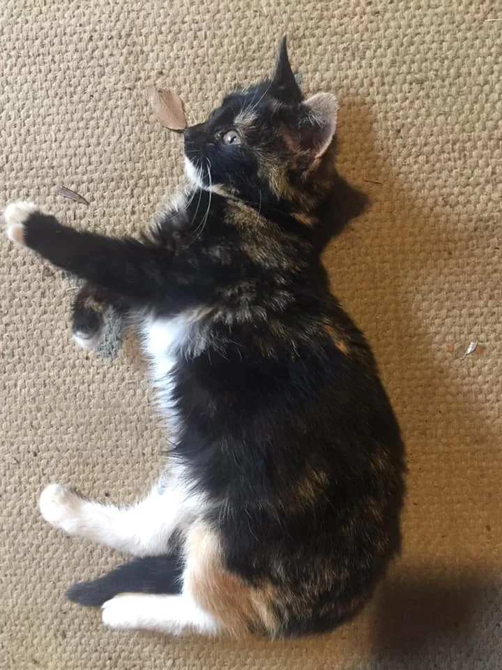 She started out as “Shelley” because she is a tortoiseshell kitteh and has a franken-leg (and part of the other) from an orange tabby.