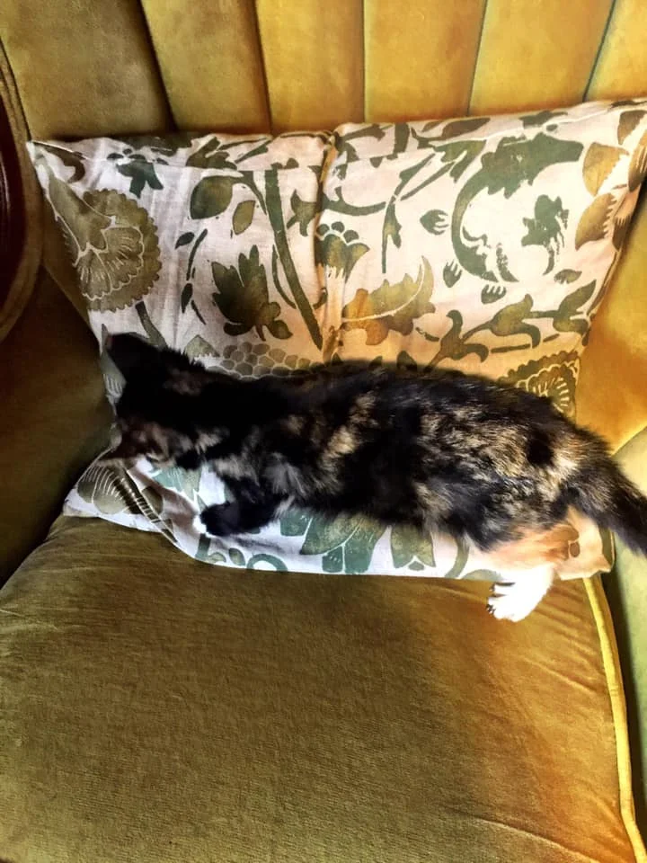 A trip to the vet this morning let us know that Frankie is approximately two months old and has a bit of an upper respiratory infection. So she’s on ten days of meds twice a day and hanging out with me in my studio, while being litter box trained.