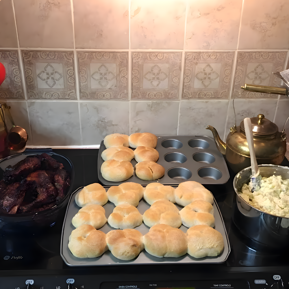 Here we are in the current coronavirus situation, making us live like Little House on the Prairie. I seem to be running a bakery now, to keep bread on hand for dinner and sandwiches. I like this basic white sandwich bread recipe from Joy of Baking, because I can get two loaves of bread and two pans of rolls or ten hamburger buns, out of one batch, by extending the first and second rise by 45 minutes to an hour. This extension also makes for a fluffy, flaky crust, which is possibly over-proving, but my family is super into it and hates dense bread.