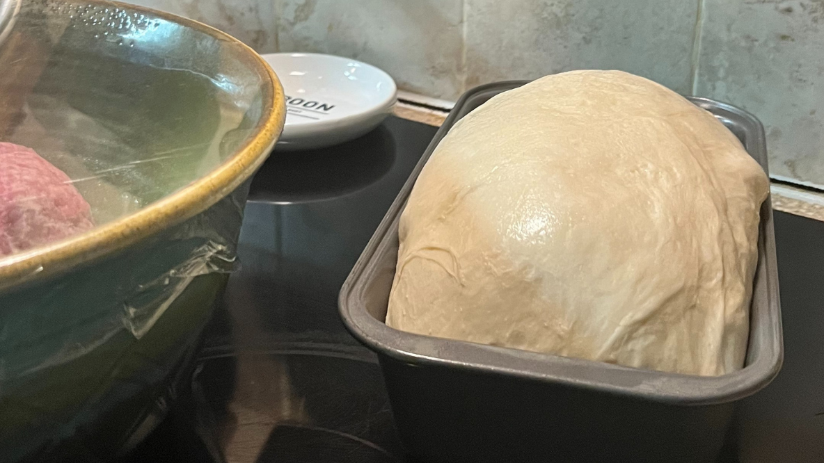 Third Rise: Next, place the rounds of dough, upside down, onto a lightly floured surface. Lightly flour the top of the dough. Form the dough into a rectangle. Take the short edge of the rectangle and fold the dough lengthwise into thirds, like you’re folding a letter. Make sure the edges of the dough are straight and even. Next, we need to shape the dough into a log shape. Take the top edge of the dough and fold it into the center and seal. Again, take the top edge of the dough and fold it over to the edge of the dough and seal. Turn the dough so the seal is now underneath. Then with the palms of your hands, gently roll the dough back and forth until it’s the length of your loaf pan. Place the logs of dough into your pans, seam side down. (The dough should fill the pan about two thirds full.) Cover each pan with plastic wrap that has been lightly floured and let proof at room temperature for 1 – 2 hours or until almost doubled in size. The dough will rise above the rim of your loaf pan. (If you lightly press into the dough, your finger will leave a slight indentation.) (If the dough starts to mushroom over the sides of the pan bake immediately.)